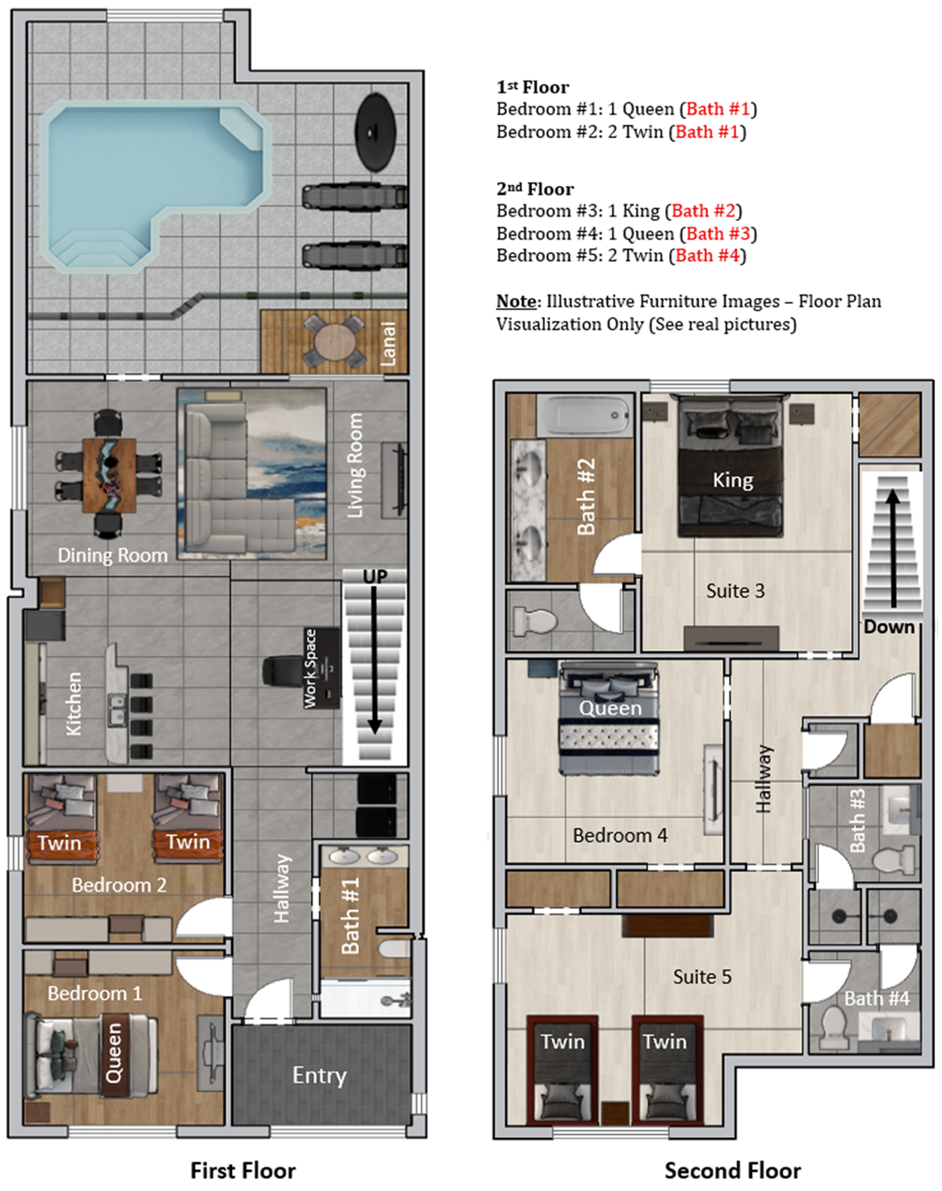 Second Floor: In the second floor you'll find 3 bedrooms and 3 bathrooms. And this home comes equipped with free Wi-Fi and cable/satellite TV. Count with LaVilla Vacation Rental to book your home today!