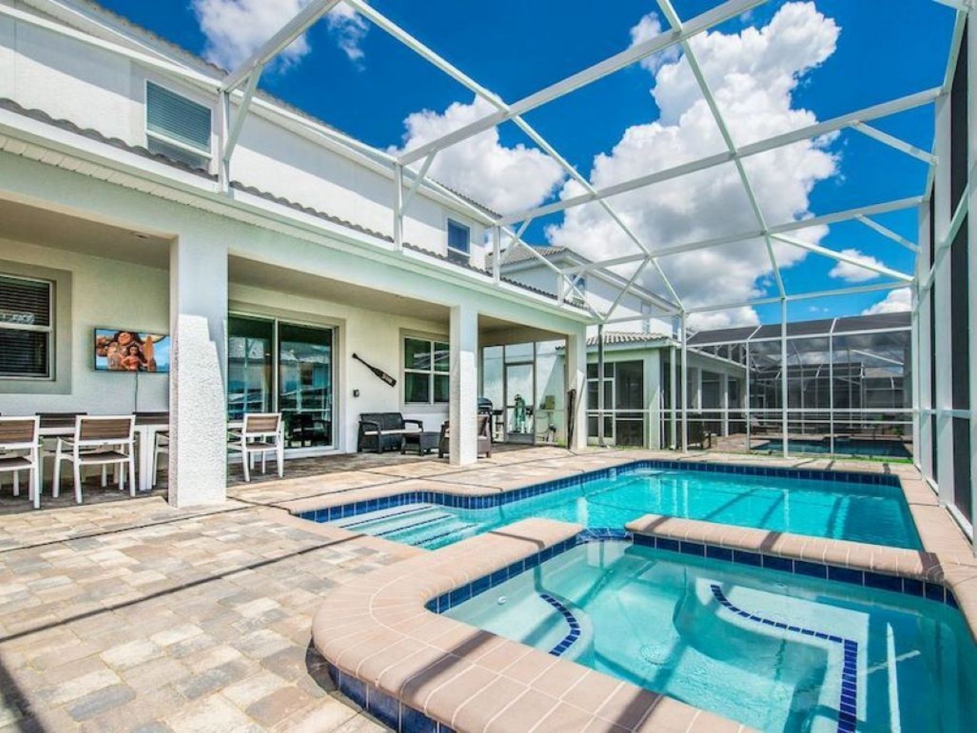 EL ESPACIO: • Televisión por cable y Wi-Fi gratis • Comedor formal • Toallas y sábanas limpias • Cocina completamente equipada • Loft con TV de pantalla plana • Aire acondicionado central • Lavadora y secadora (en el establecimiento) • No se proporcionan paños • Secador de pelo, plancha y tabla de planchar • Calefacción de piscina (con cargo adicional) - Opcional ** • Alquiler de barbacoa (con cargo adicional) - Opcional • Piscina privada + valla de seguridad para niños • 2 habitaciones familiares con TV de pantalla plana • Código de puerta privado para cada estancia de los huéspedes • Terraza cubierta + muebles de patio y tumbonas • Si desea otros equipos, póngase en contacto con nosotros para hacer los arreglos, ya que tenemos una gran variedad de artículos disponibles para alquilar. (Costo adicional)