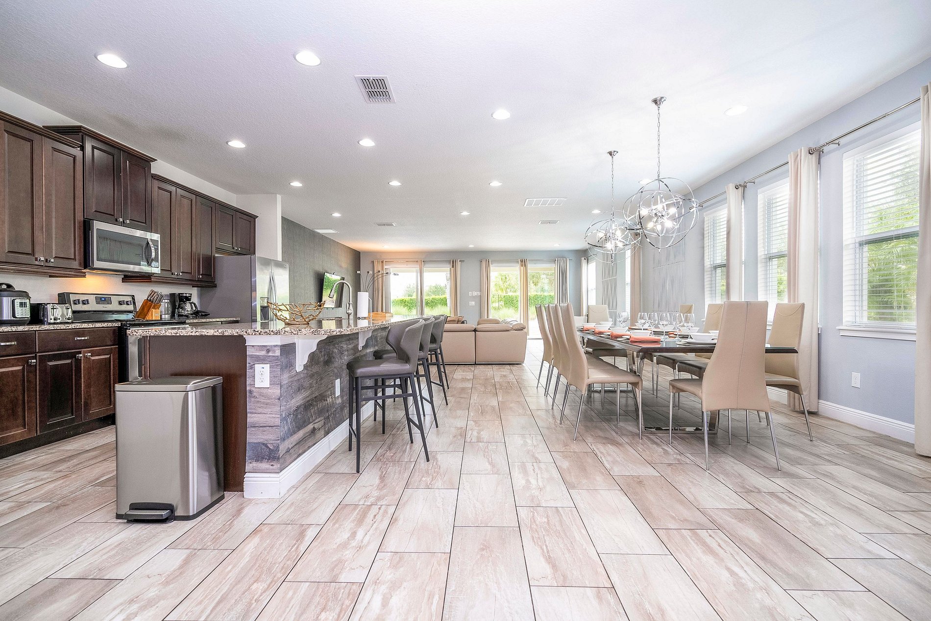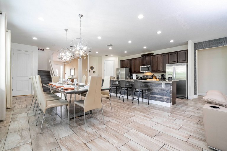 Primer piso: garaje - sala de juegos/la cocina está completamente equipada con electrodomésticos modernos y utensilios de cocina gourmet para comidas caseras que le encantarán a su grupo. El espacio habitable es de concepto abierto y conecta la cocina con la sala de estar y el comedor para una vida social sin obstáculos. Una mesa de comedor de 10 asientos y una barra de desayuno de 4 asientos también contribuyen al ambiente comunitario y le brindan la opción de cenar de manera formal e informal. Además, tiene una lavadora y secadora completas para que lavar la ropa sea fácil y gratuito. Manténgase al día con la ropa y disfrute de una escapada limpia.
