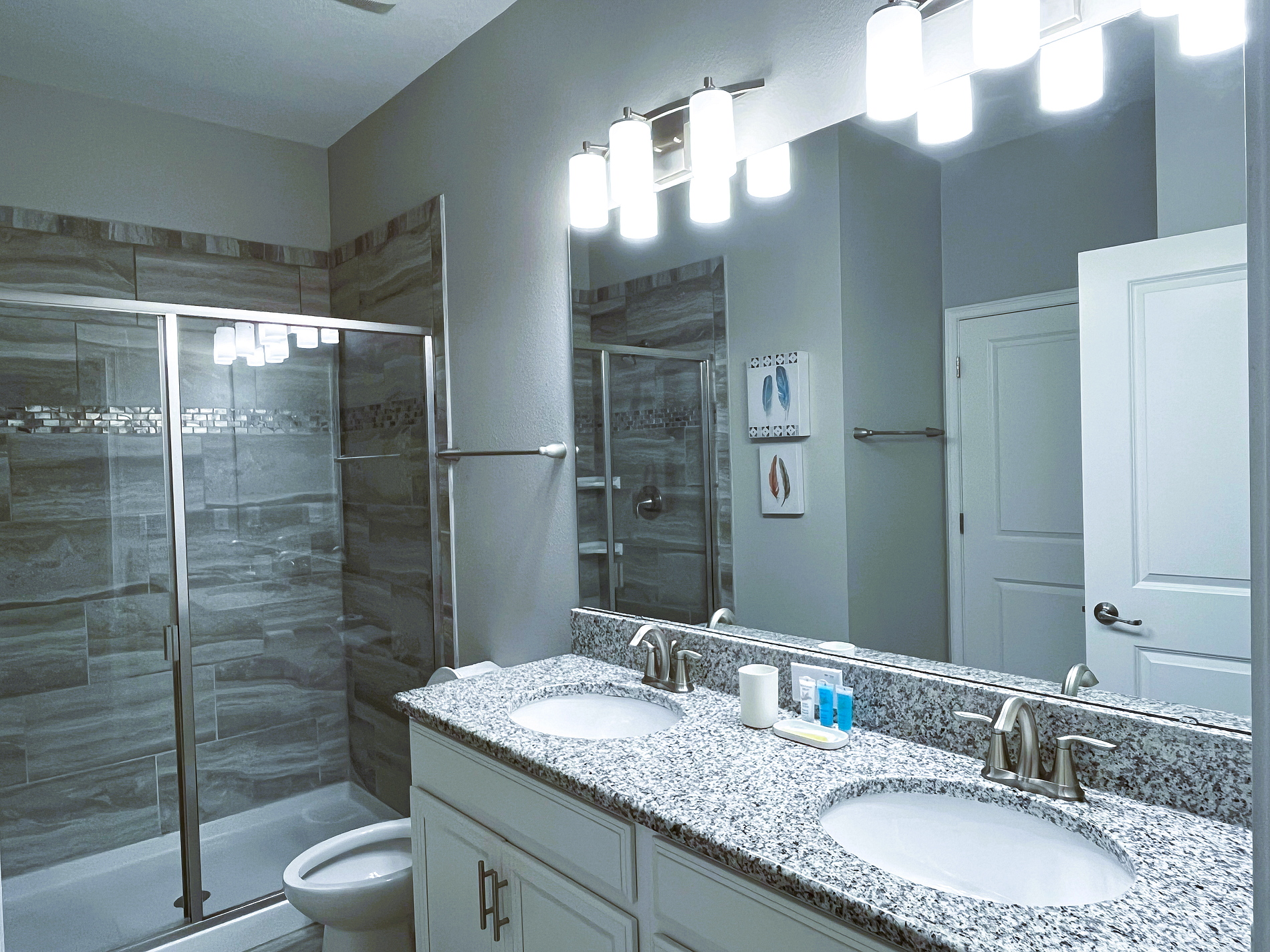 Self-Catering Homes Contain Initial supply of starter items including: -1 Mini hand soap per bathroom, 1 Mini Shampoo per bathroom, 1 Mini Conditioner per bathroom, 2 rolls of toilet paper per bathroom, 2 dishwasher detergent pods, 1 Trash bag inside can + 1 extra and 1 roll of paper towels.