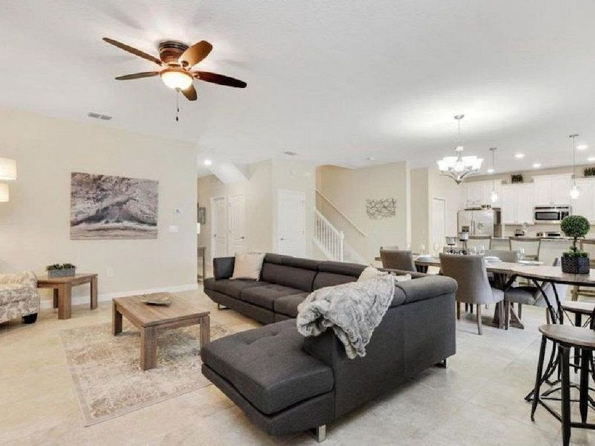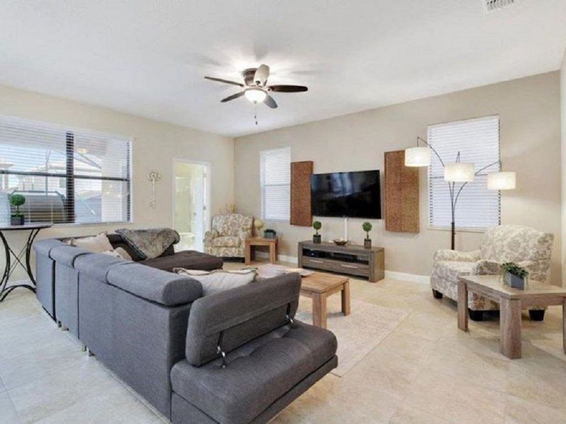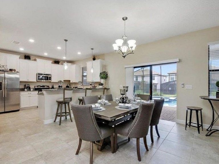 Primeiro andar: No primeiro andar, há duas suítes master disponíveis com sua própria tela plana em cada quarto. Esta casa vem com uma cozinha totalmente equipada, abastecida com utensílios essenciais de cozinha e utensílios de cozinha para que você possa cozinhar para sua família e amigos enquanto se reúne neste conceito de planta baixa aberta. A sala de estar é integrada à sala de jantar e cozinha. A mesa de jantar acomoda 6 e o balcão de café da manhã acomoda 3. Há outro banheiro completo na sala de estar com acesso à área da piscina. A lavanderia está localizada no primeiro andar e inclui uma lavadora e secadora de tamanho normal para sua conveniência. A garagem se transformou em uma bela sala de jogos equipada com mesa de tênis, mesa de sinuca e espaço para jogos para entreter toda a família.