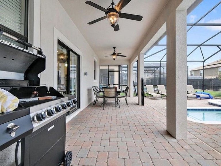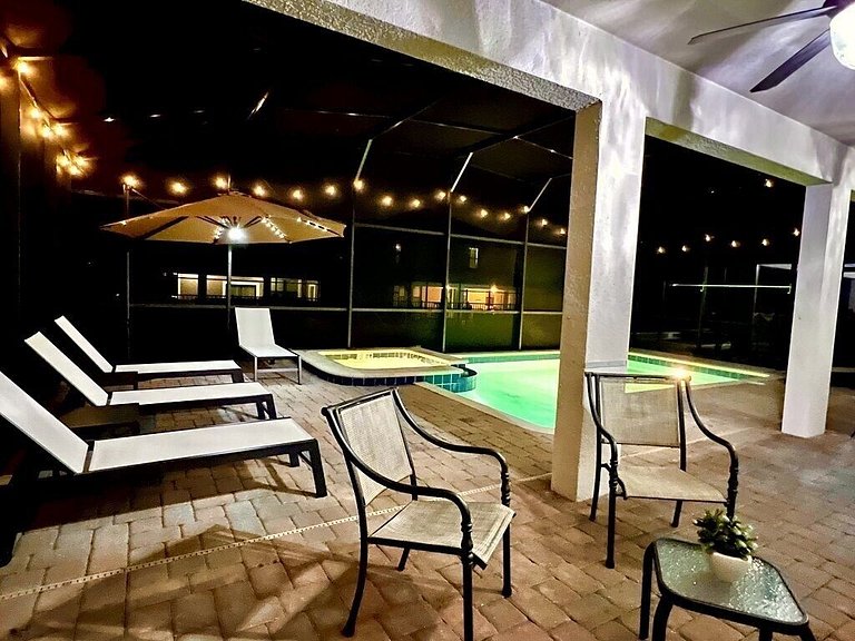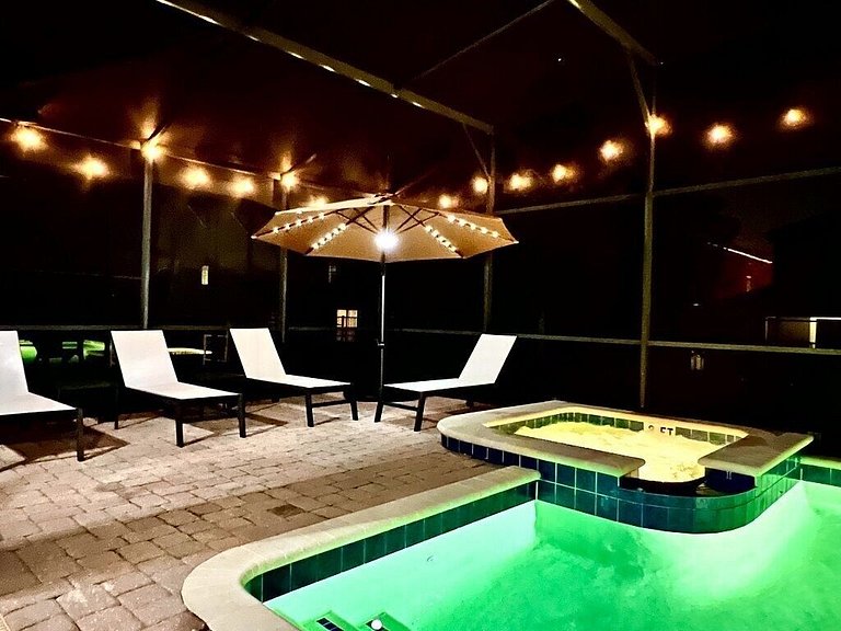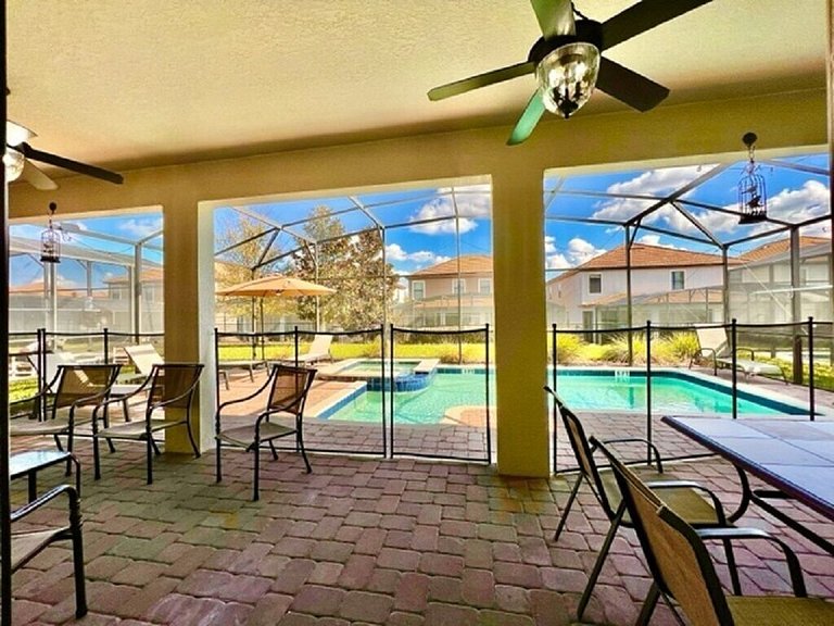 Área externa: Esta casa tem uma grande piscina, incluindo um spa, perfeito para as crianças que aproveitarão seu mergulho diário. Você certamente aproveitará horas de diversão ao sol! A área da piscina inclui uma mesa de jantar para 6 pessoas, cerca de segurança para piscina, 4 espreguiçadeiras ao ar livre para que você possa sentar e relaxar aproveitando seu churrasco na Flórida em sua varanda privativa. Você não poderia pedir um resort melhor para você e sua família. Churrasqueira e piscina aquecida/Spa são opcionais (custo extra).