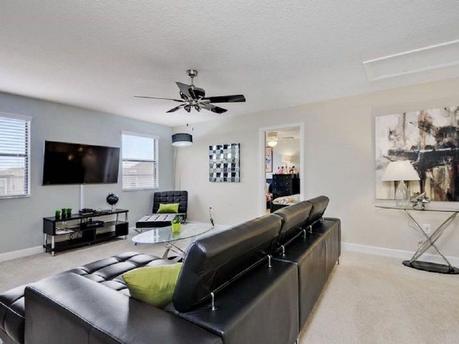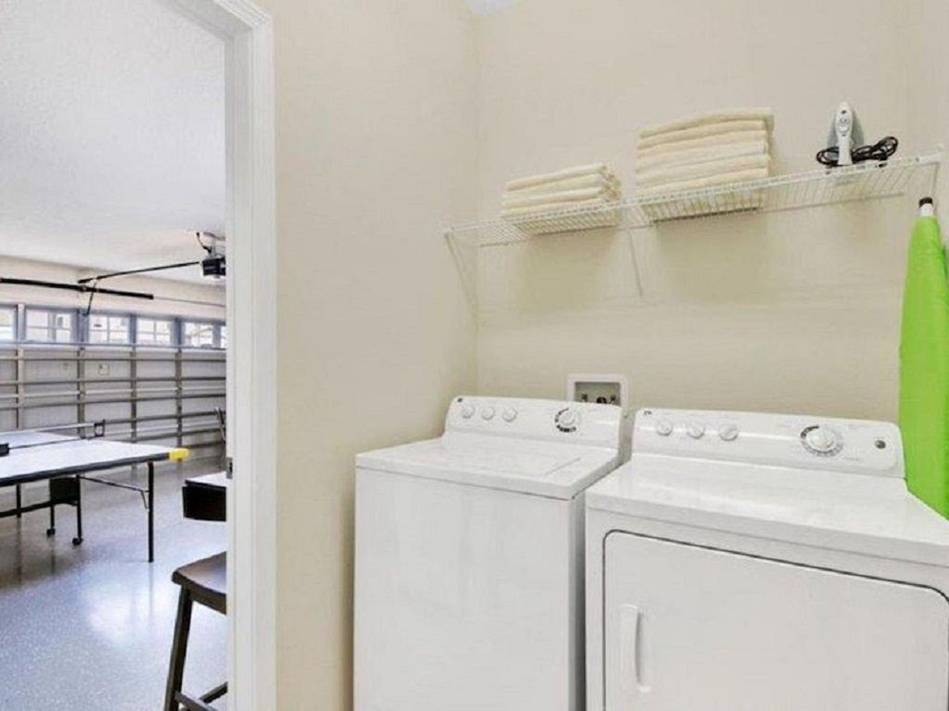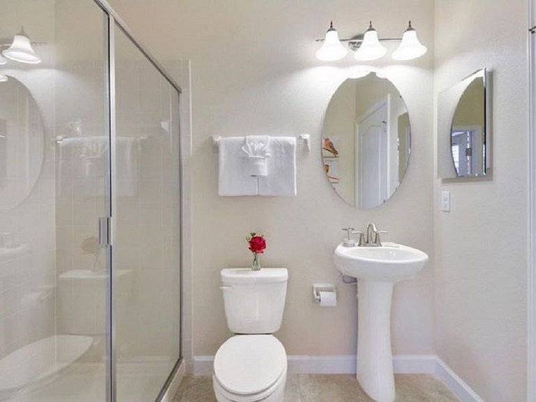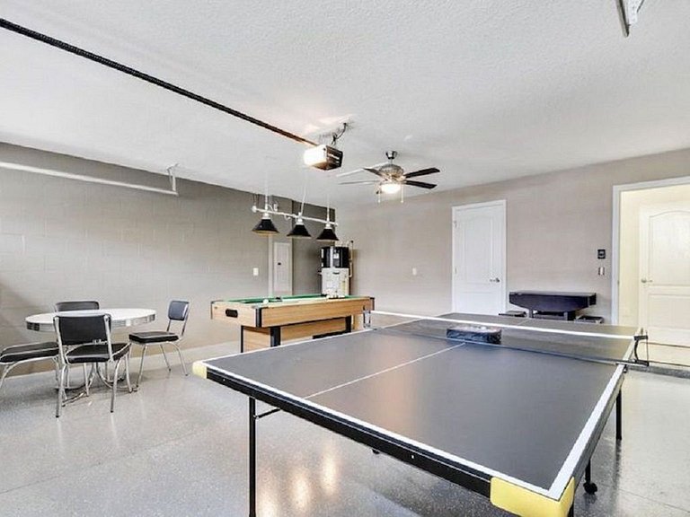 Primeiro andar: No primeiro andar, há duas suítes master disponíveis com sua própria tela plana em cada quarto. Esta casa vem com uma cozinha totalmente equipada, abastecida com utensílios essenciais de cozinha e utensílios de cozinha para que você possa cozinhar para sua família e amigos enquanto se reúne neste conceito de planta baixa aberta. A sala de estar é integrada à sala de jantar e cozinha. A mesa de jantar acomoda 6 e o balcão de café da manhã acomoda 3. Há outro banheiro completo na sala de estar com acesso à área da piscina. A lavanderia está localizada no primeiro andar e inclui uma lavadora e secadora de tamanho normal para sua conveniência. A garagem se transformou em uma bela sala de jogos equipada com mesa de tênis, mesa de sinuca e espaço para jogos para entreter toda a família.