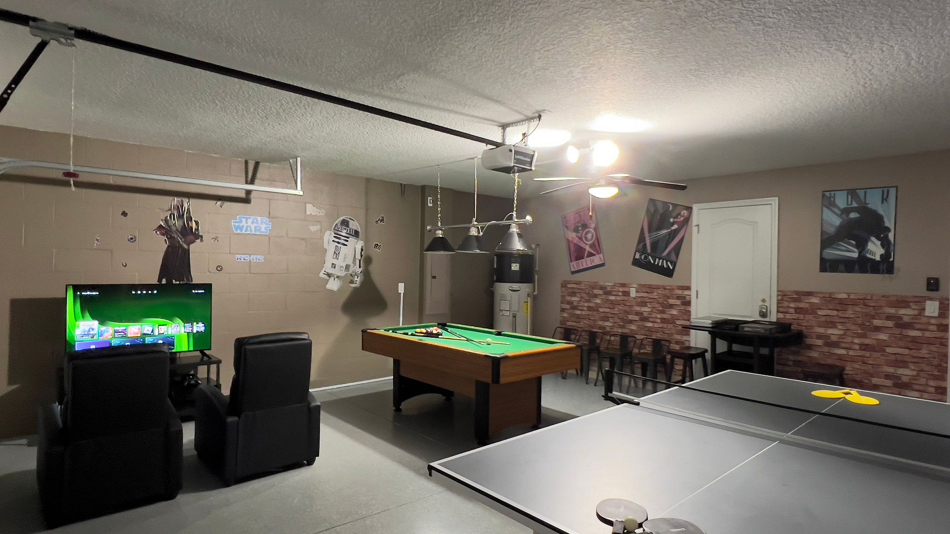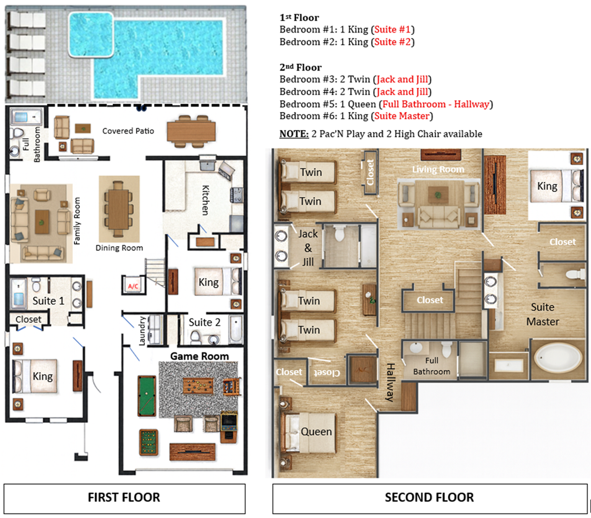 Primeiro andar: No primeiro andar, há duas suítes master disponíveis com sua própria tela plana em cada quarto. Esta casa vem com uma cozinha totalmente equipada, abastecida com utensílios essenciais de cozinha e utensílios de cozinha para que você possa cozinhar para sua família e amigos enquanto se reúne neste conceito de planta baixa aberta. A sala de estar é integrada à sala de jantar e cozinha. A mesa de jantar acomoda 6 e o balcão de café da manhã acomoda 3. Há outro banheiro completo na sala de estar com acesso à área da piscina. A lavanderia está localizada no primeiro andar e inclui uma lavadora e secadora de tamanho normal para sua conveniência. A garagem se transformou em uma bela sala de jogos equipada com mesa de tênis, mesa de sinuca e espaço para jogos para entreter toda a família.